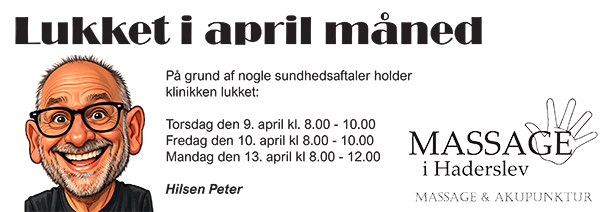 Du er naturligvis også velkommen til at kontakte Peter Rasmussen hos MASSAGE i Haderslev på tlf/sms 30405051 eller peter@massageihaderslev.dk