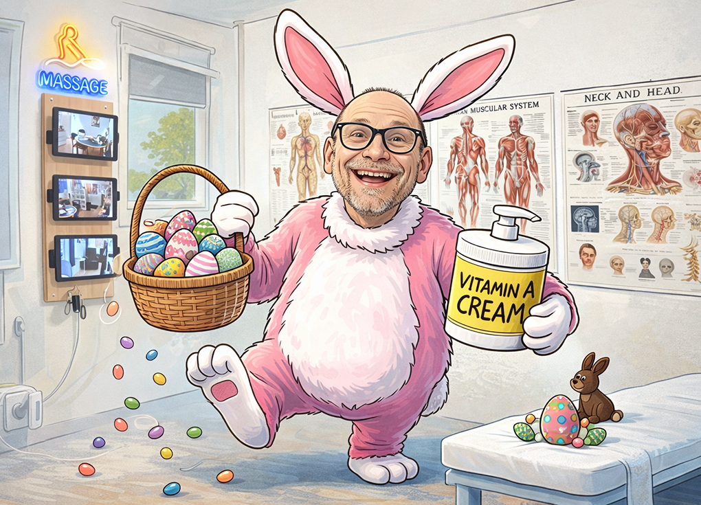 Påskeharen har indfundet sig hos MASSAGE i Haderslev. Tegning: Chat GPT