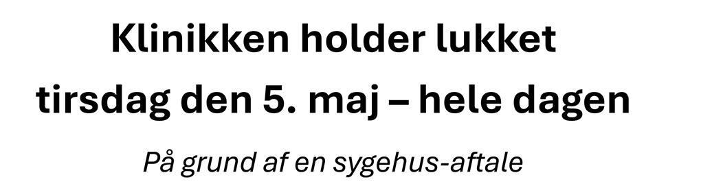Et par sundhedsaftaler venter endnu, så derfor vil klinikken være lukket nogle få gange endnu. Mest markant tirsdag den 5. maj, hvor der er lukket hele dagen.