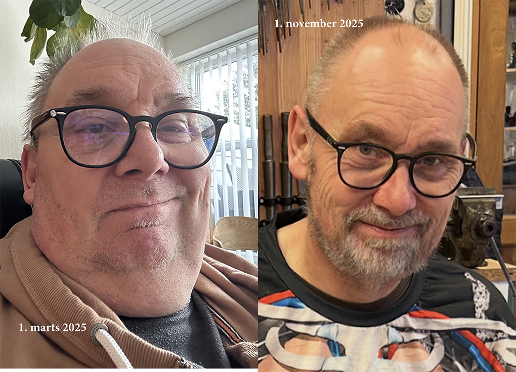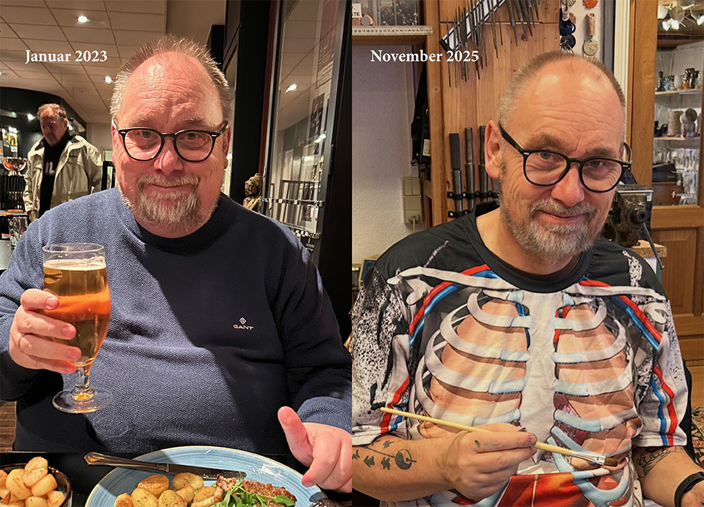 Det første viser den syge udgave af mig, den 1. marts 2025 og den sundere udgave pr 1. november. Meget sundere og 38 kilo lettere.