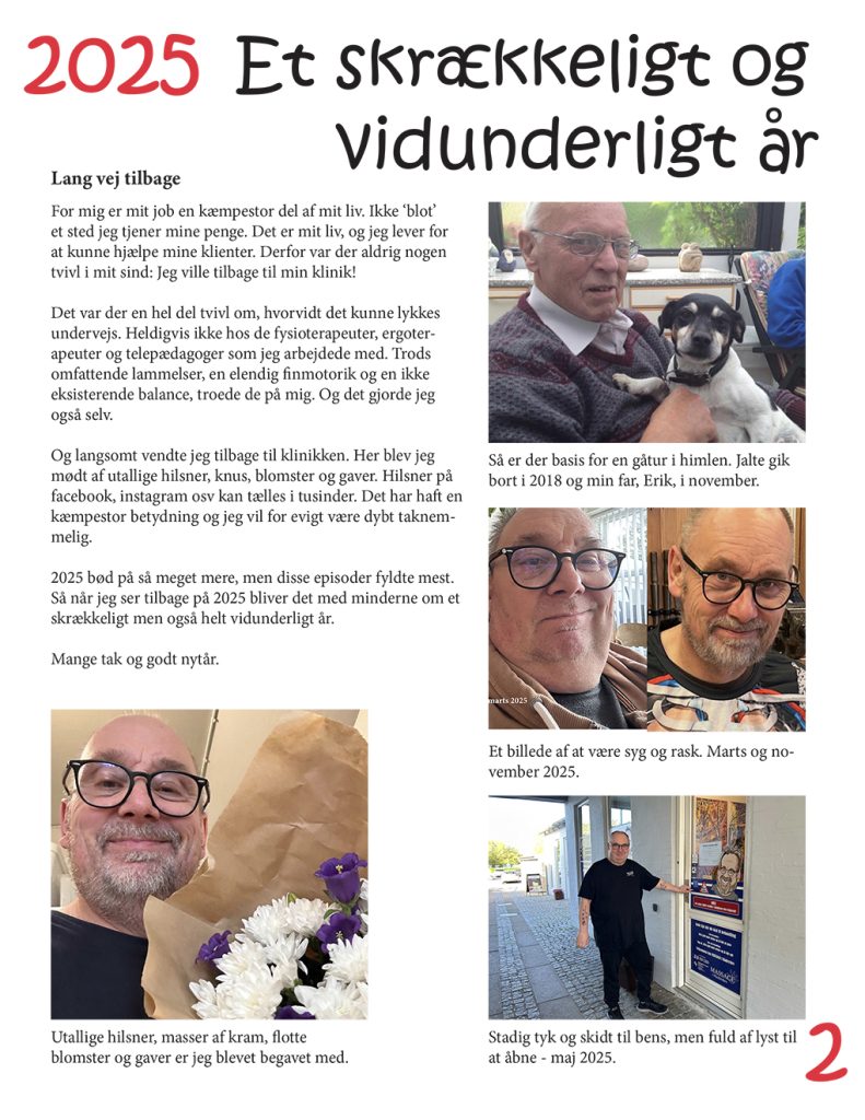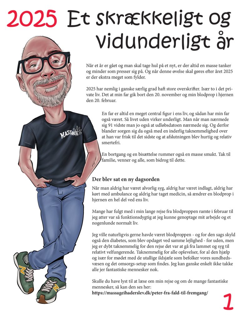 Aabenraa sygehus har spillet en kæmpe rolle i mit liv i 2025. Først med otte dages indlæggelse og siden med kontroller. I forhold til min behandling for blodproppen er jeg nå overgået til egen læge.